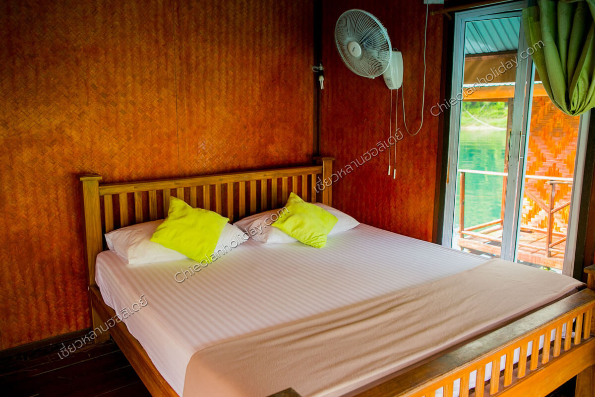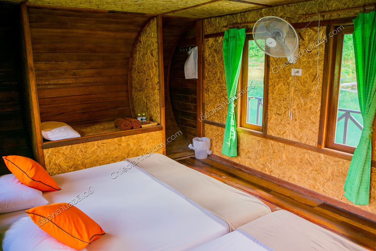 • ห้องพักแบบที่ 2 แพเรือนไม้ห้องกระจก เป็นห้องพักที่มีการติดกระจกใสรอบด้าน สามารถมองเห็นทัศนียภาพของผืนน้ำและทิวเขาได้จากภายในตัวแพเลย นอนพักได้ประมาณ 2 คน มาเที่ยวกับแฟนหรือคนรักจะเหมาะมาก ๆ